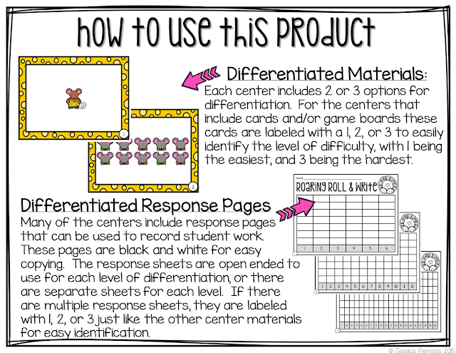 Next up, the centers each have 2-3 differentiation options. These may be different sets of cards, game boards, dice, response sets etc. I find this SUPER important so all kids in my class can get the most out of each center. Not every child is working at the same level, but with these centers you don’t have to think about having separate centers for students above or below grade level.