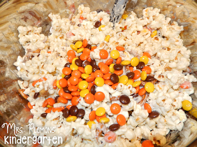 2. Add pretzel pieces and candy to the popcorn and toss to mix.