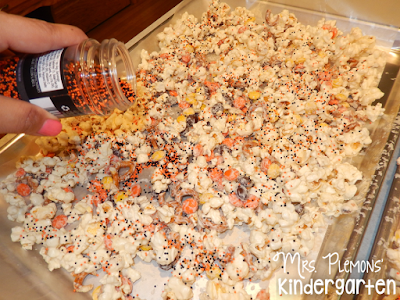 5. Pour popcorn mixture onto wax lined cookie sheets and sprinkle with Halloween sprinkles before the candy sets.