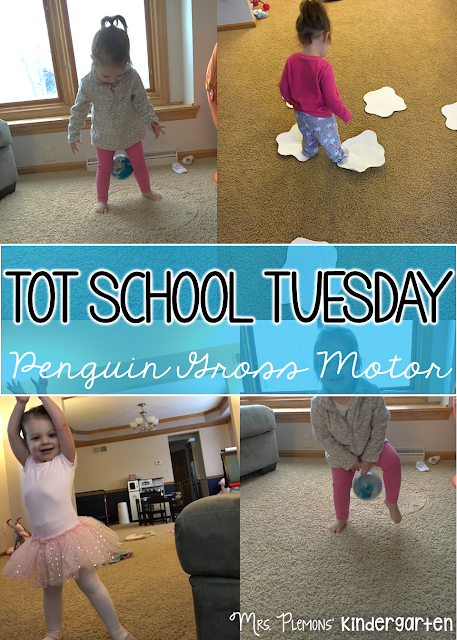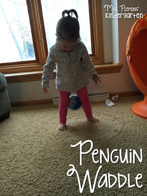 I wasn’t to sure how this one would go with Madelynn, but it actually was our favorite activity of the week. Basically I had her try to hold a ball between her legs while walking to get her to “waddle” like a penguin. Trying to keep the ball in there was pretty tricky and kept her VERY busy, plus our dog thought it was fun too and kept trying to get the ball.