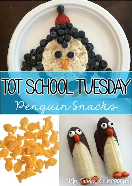 Yum! I decided making cute snacks is one of my favorite parts of tot school because I am SOOO not a cook, but I can do cute things without much need for real cooking knowledge. This week I really only got to 2 of our planned snacks but the banana penguins were a big hit and super delicious so we did those twice!