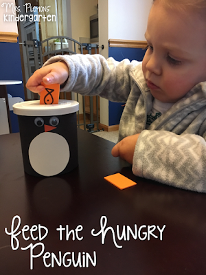 I grabbed an empty frosting container and turned it into a penguin with a little construction paper and googly eyes, then a small slit in the top. I made a bunch of rectangles out of foam and then drew some little fish on each one with sharpie. Madelynn was very serious about this activity, look at that concentration, haha. By Friday she had ripped the penguin off of the container, but at least it got great use all week.