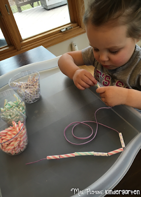 I always see the cutest themed paper straws in the dollar spot, but never know what to do with them.Well I finally found a fantastic use for them this week! I cut them up into smaller pieces and we used them as beads to make necklaces. So pretty!
