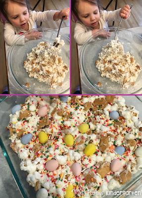 This was essentially the same recipe as rice krispy treats just with popcorn substituted for the cereal. Then we added sprinkles and little cadbury mini eggs on top to make it more festive. These were so good we ate them for snack 3 days in a row, YUM!