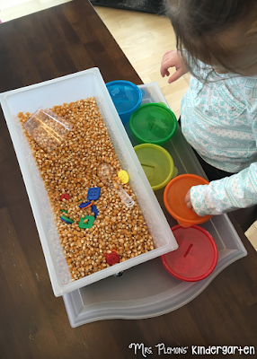 Included in this bin: popcorn seeds, circle, square, and rectangle buttons, colored bowls, scoops, and cups.