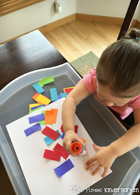 We definitely need more work with gluing, so we did the same activity as last week, but with rectangles this time. I cut up a bunch of bright colored rectangles and we glued them to a piece of paper for this easy little art project.