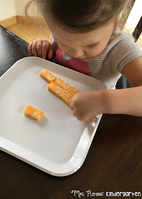 I usually buy these cheese squares for Madelynn from Target for snack so I made them into little rectangles that she could build with. She’s really into lining things up lately so that kept her pretty engaged.
