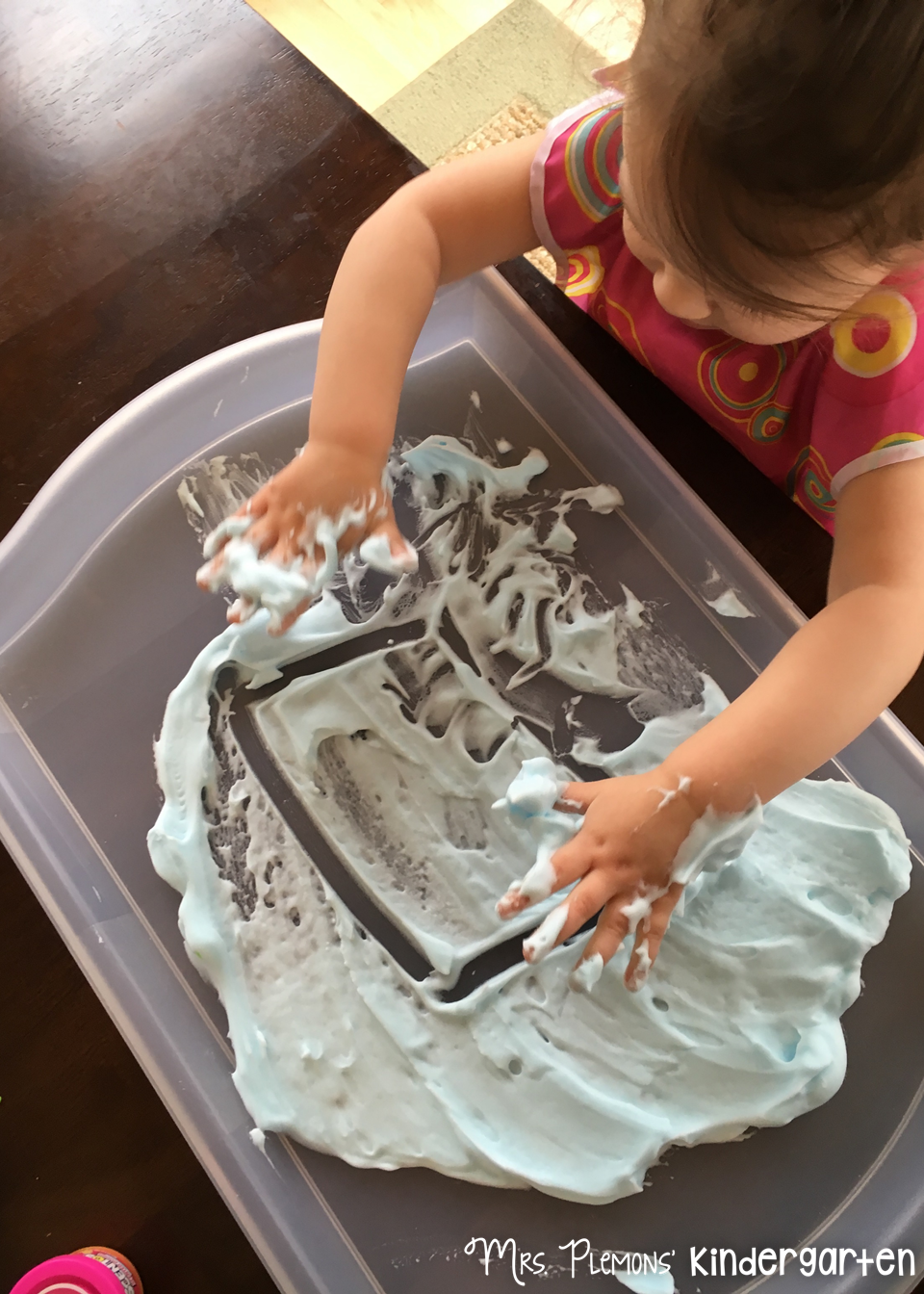 I actually ditched the shaving cream, for blue foam soap. It smelled amazing and added a little sensory experience. Madelynn drew rectangles and other shapes with some help from me and just played with the soap too.