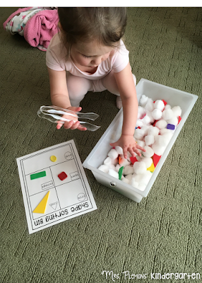 Included in this bin: cotton balls, shape buttons, foam shapes, plastic shapes,tongs, sorting mat.