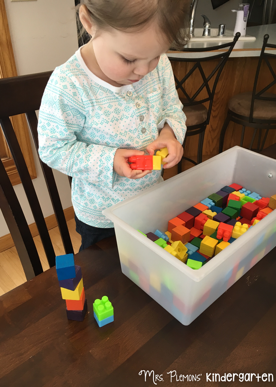 So blocks are technically cubes, but they have square faces right? I filled the bin with wooden cubes and square legos for M to build and stack and it kept her pretty busy.