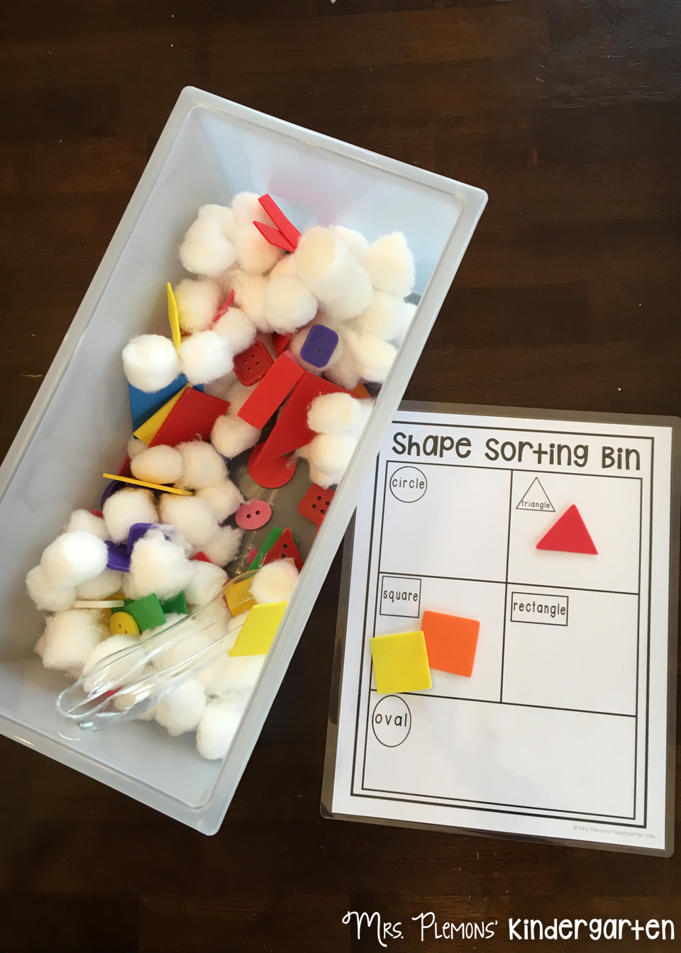 Included in this bin: cotton balls, shape buttons, foam shapes, plastic shapes,tongs, sorting mat.