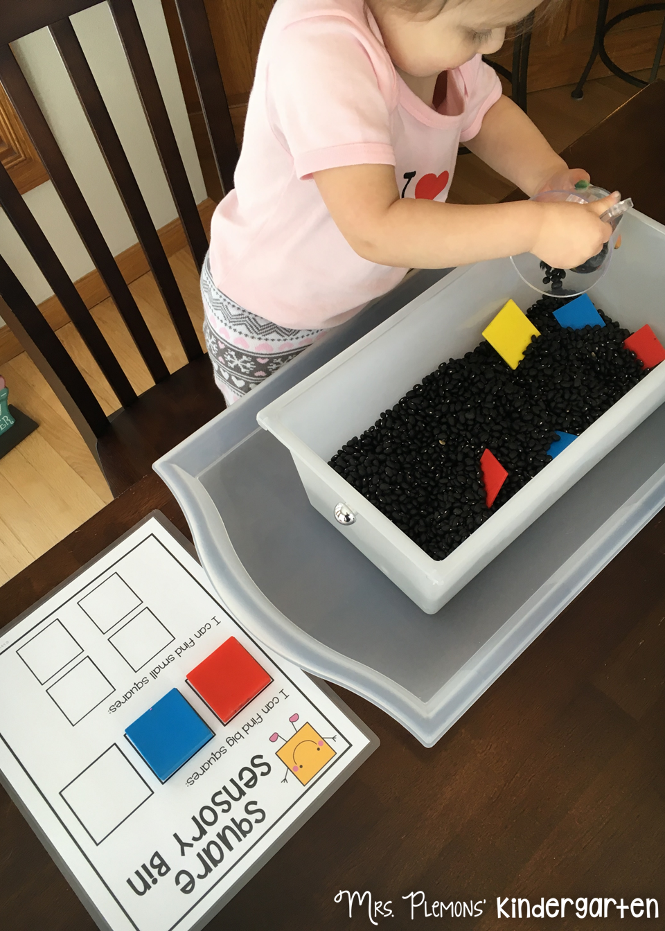Included in this bin: black beans, plastic squares big & small, cups, scoops, sorting mat.