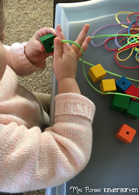 Our last activity for the week was threading square beads. Madelynn did pretty well with these since the beads had very large holes. Much easier than the buttons from last week!