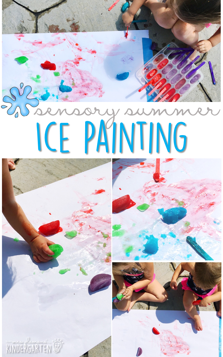 For some more painting fun I made colored ice cubes with Jello! I didn’t want to use liquid watercoloring because I knew the girls would be tempted to taste them. I mixed 1 cup water with 1 packet of Jello, then froze them in trays with popsicle sticks for handles. Then I taped a sheet of butcher paper on the ground and let the girls paint and taste away! Lots of sticky messy fun that smelled amazing!