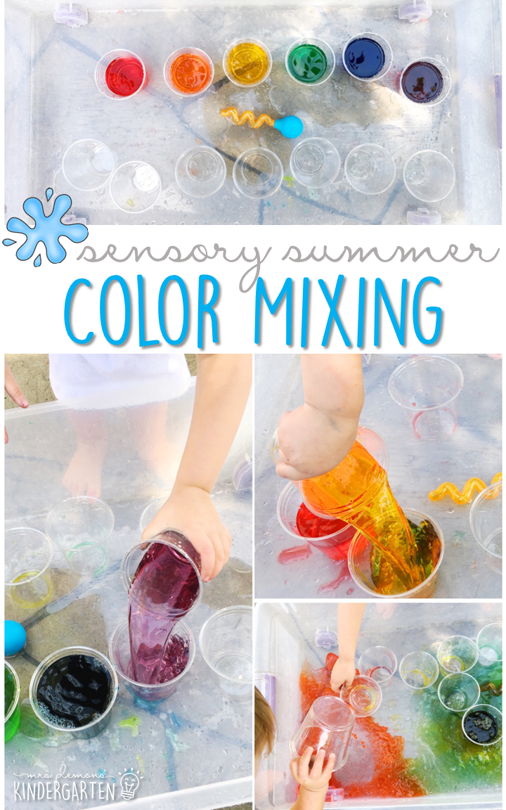 For our color mixing activity, I set up cups with a rainbow of colored water. This activity didn’t last long before all the water was brown, but the girls enjoyed the dumping and scooping the water even after all the pretty colors were gone.